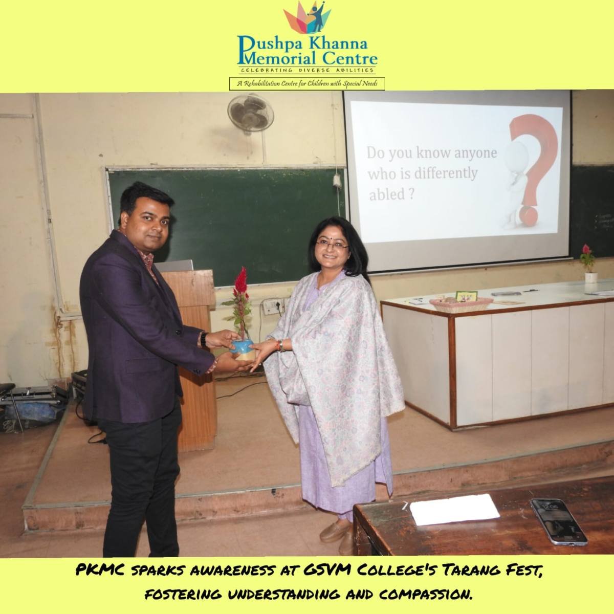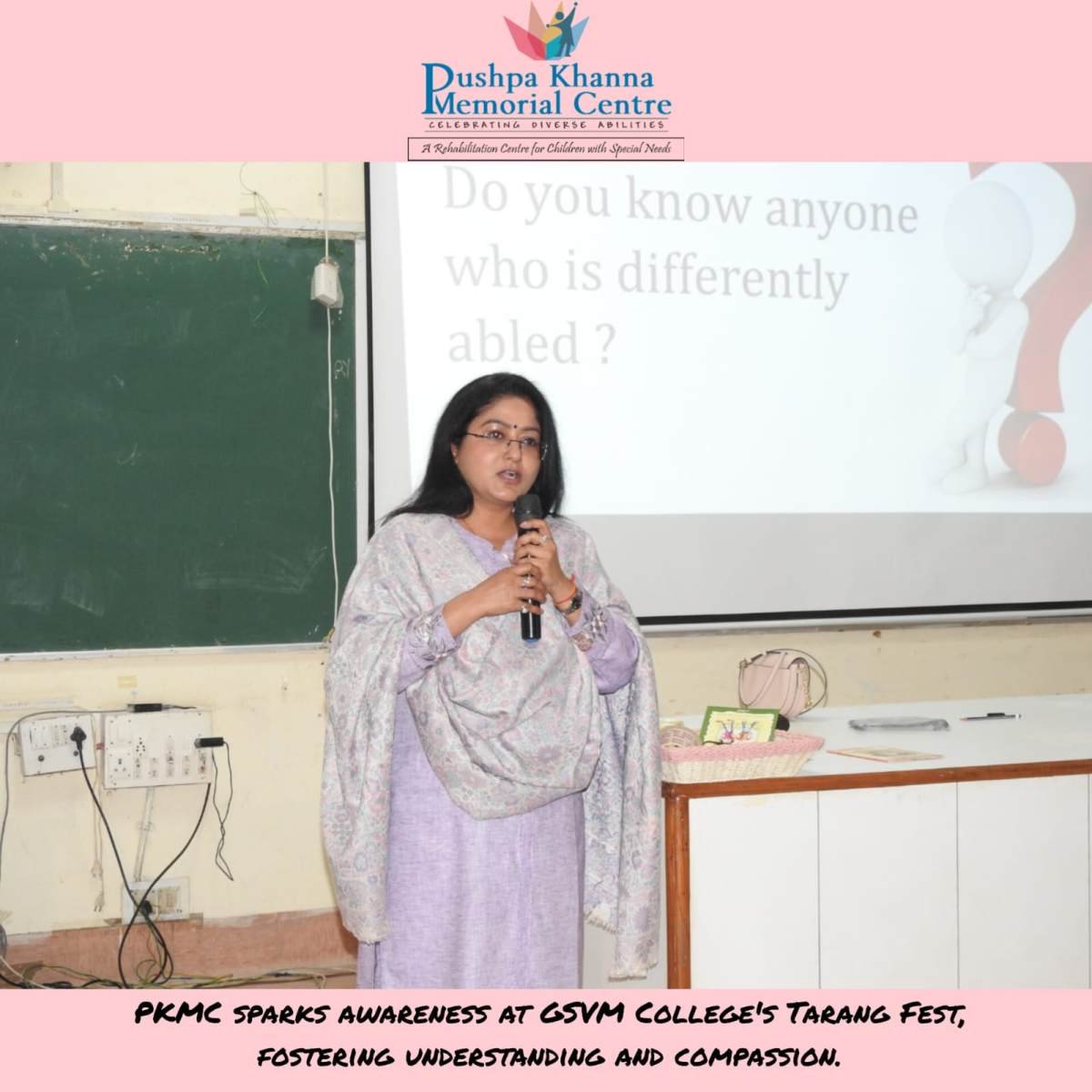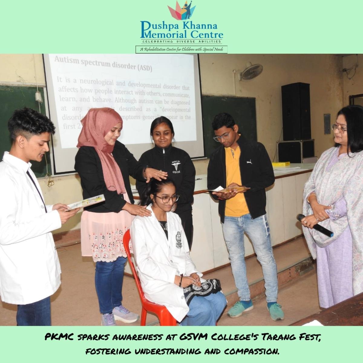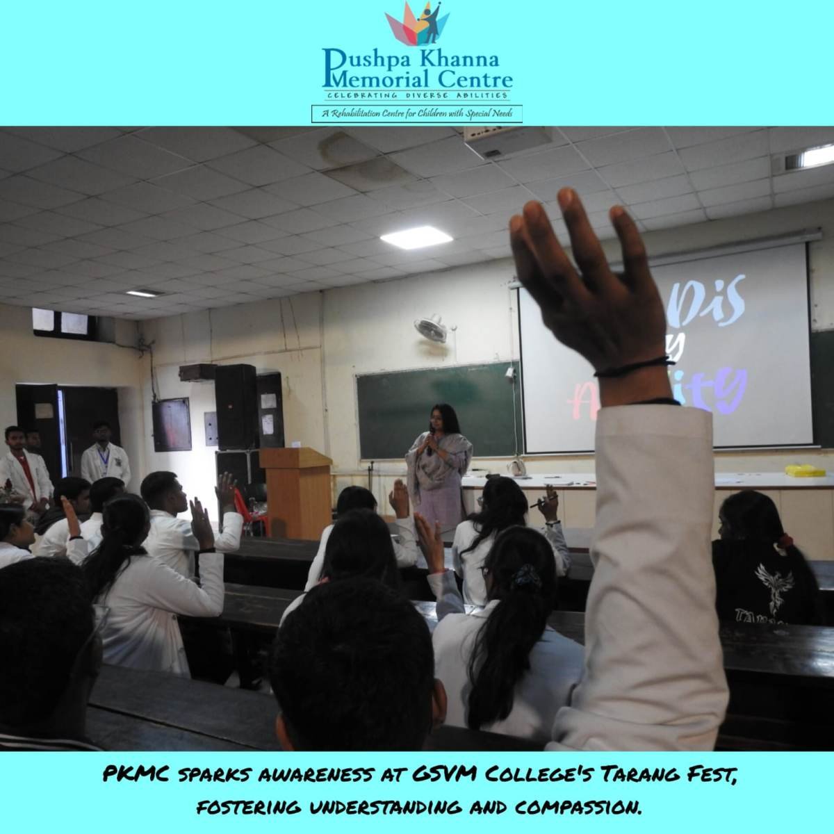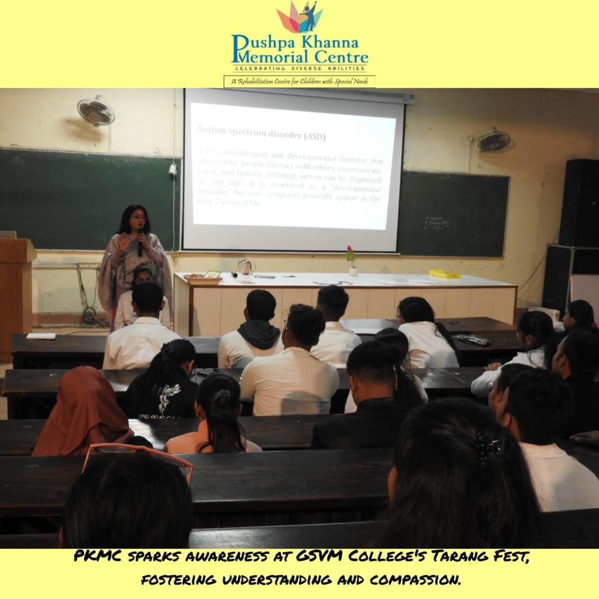 Our director, Ms. Ruma Chaturvedi, enlightens undergraduates at GSVM College during the Tarang Fest, fostering understanding and compassion toward different disabilities.