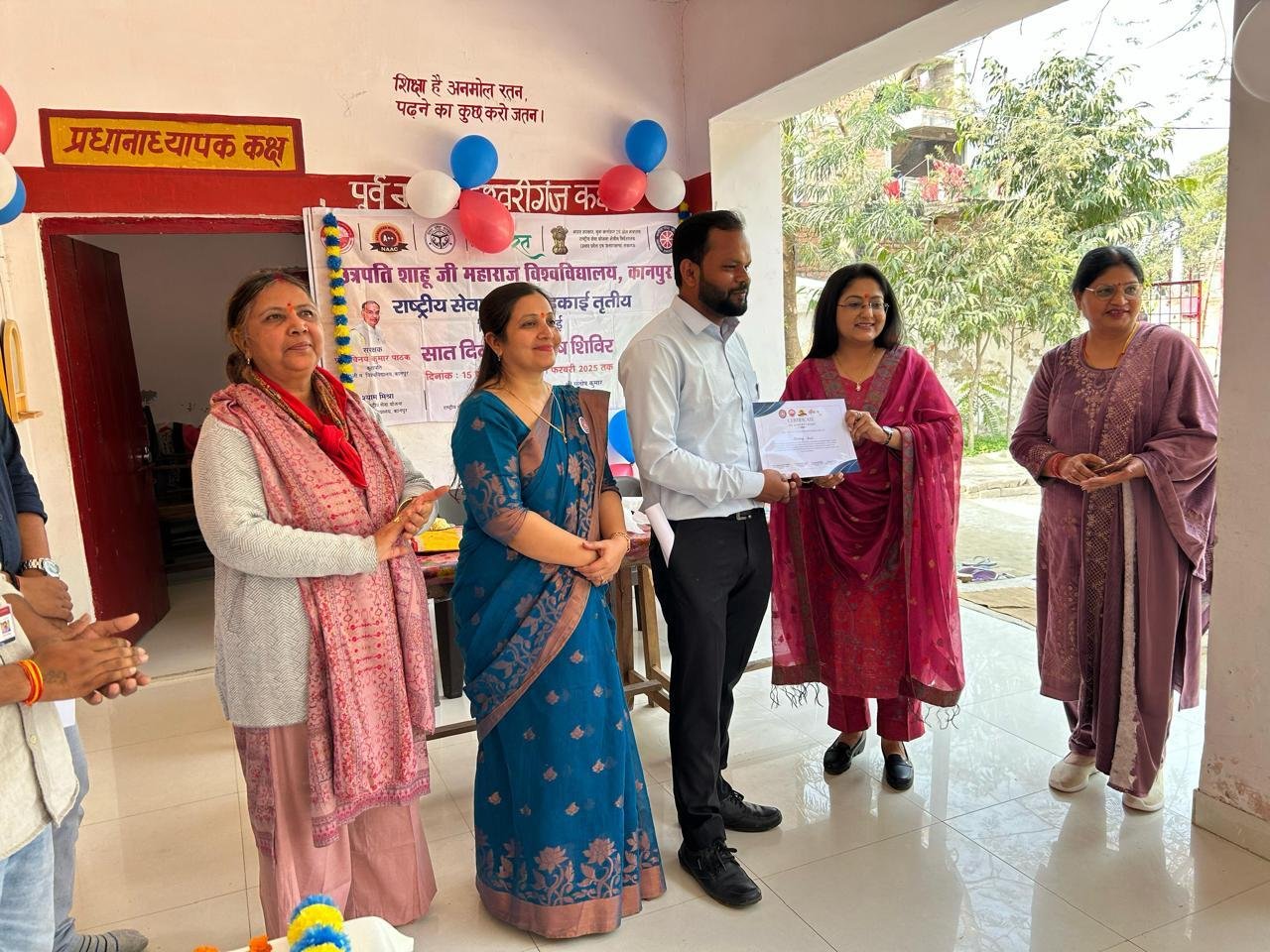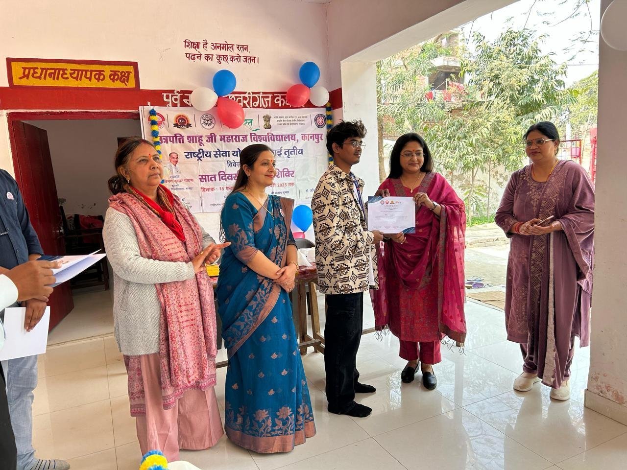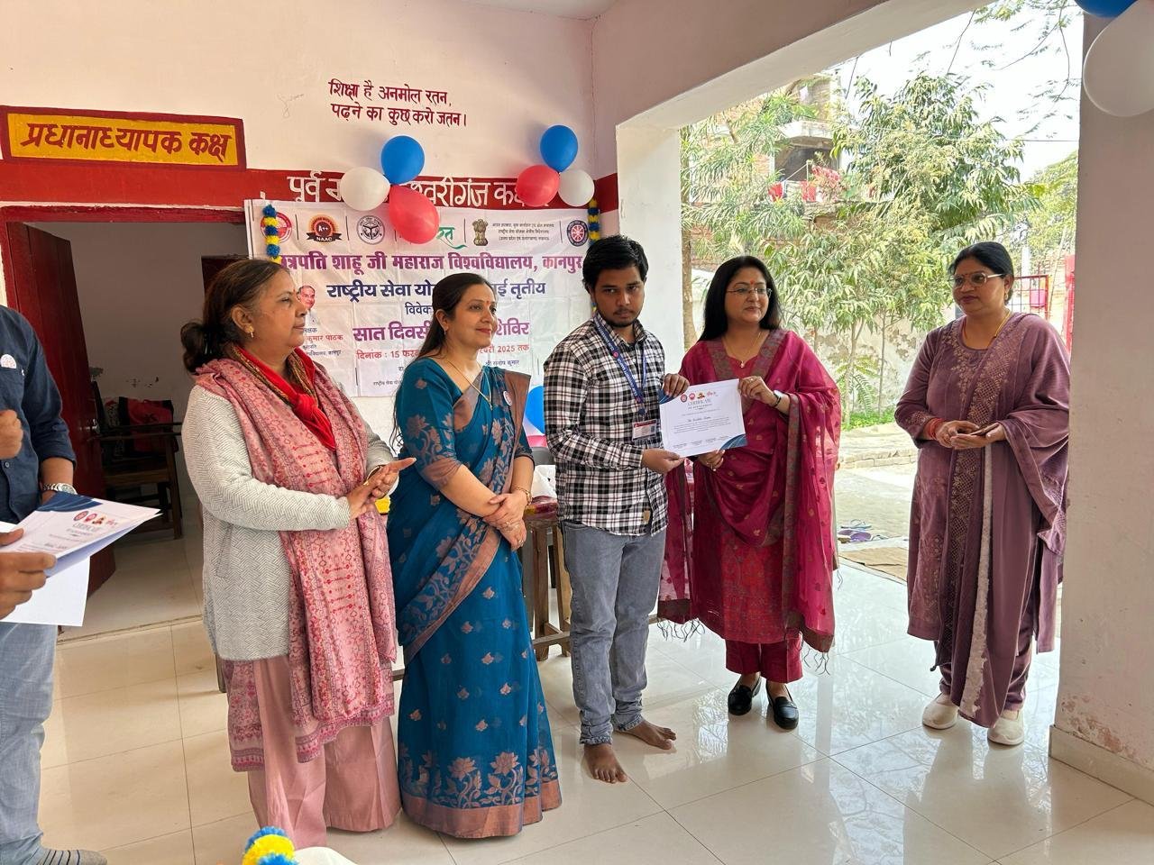 CSJM University’s Department of Education, under the leadership of HOD Dr. Sneh Pandey, organized a 7-day NSS camp in the adopted village of Ishawaipur as part of the National Service initiative. The camp aimed at spreading awareness on various important topics among the villagers with participation from students across diverse fields of engineering and humanities. Today marks the concluding day of the camp, where our Director, Ms. Ruma Chaturvedi, was invited as the Chief Guest to interact and encourage the students by awarding them certificates for their commendable efforts.