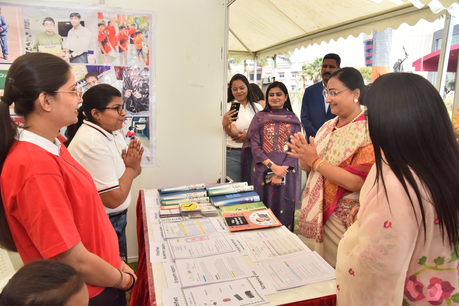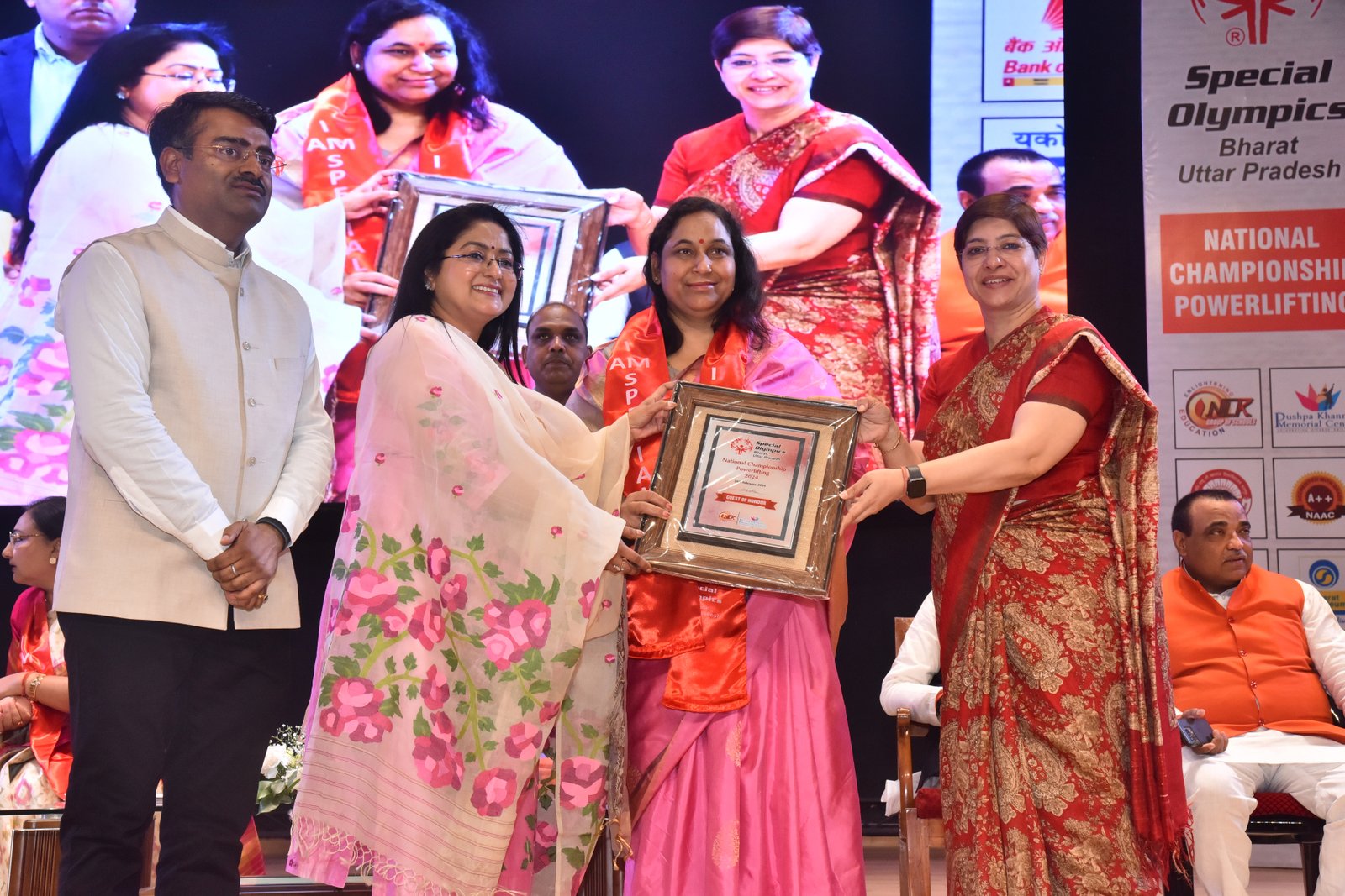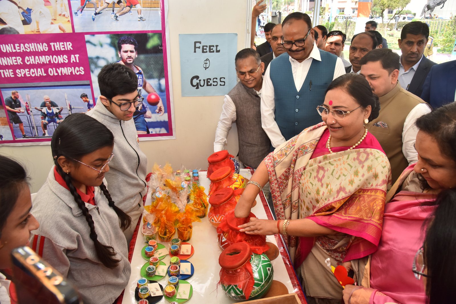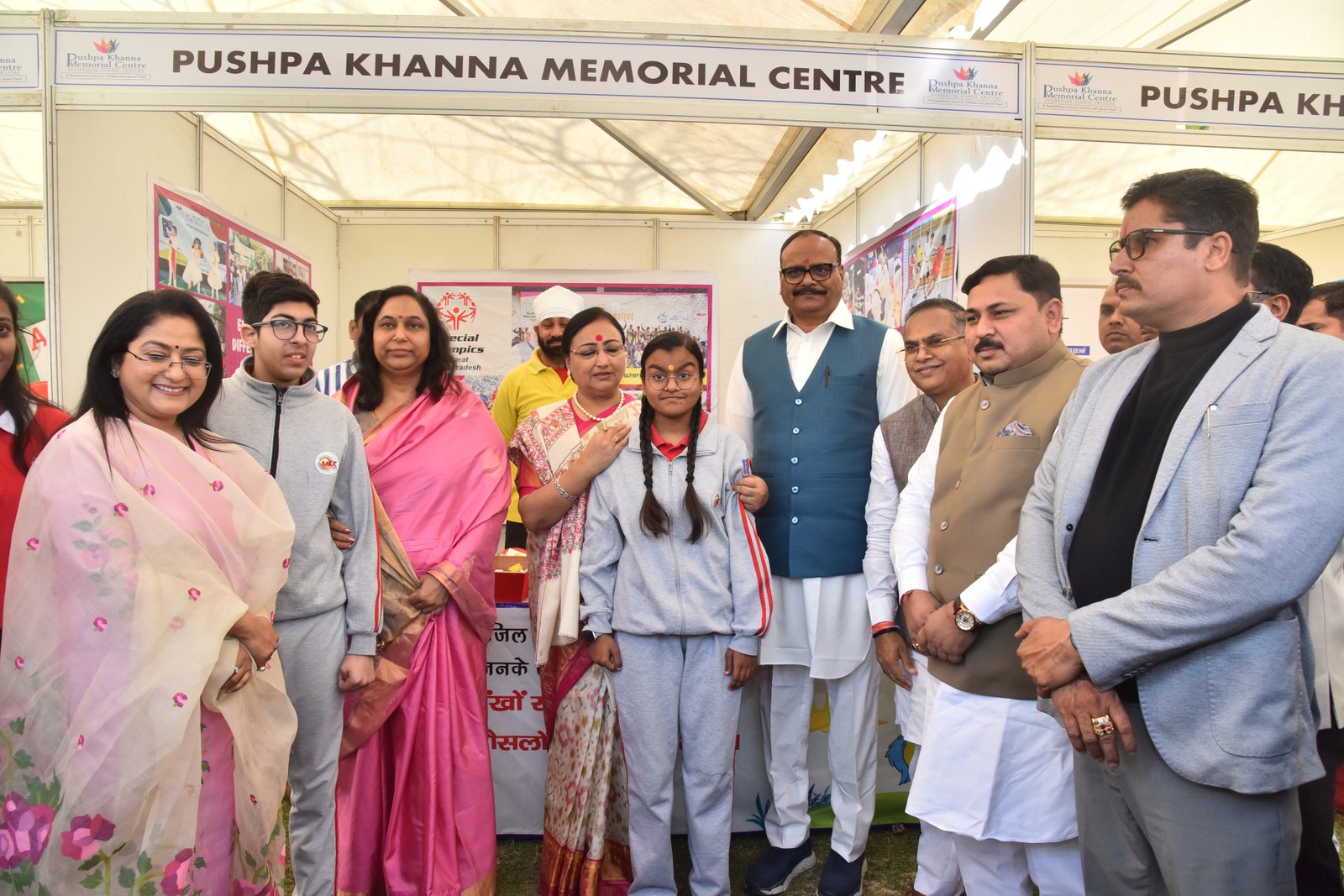 We proudly participated in the Special Olympics Bharat National Championship Powerlifting event held at CSJM University's Virangna Lakshmi Bai Auditorium! At the stalls of the Pushpa Khanna Memorial Centre, we showcased awareness initiatives, intervention resources, inclusion methodologies, and handcrafted items made by children. Our esteemed guests, Dr. Malika Nadda and Deputy Chief Minister Shri Brijesh Pathak, engaged with the children, commending their participation and dedication. Ms. Ruma Chaturvedi, our Director, presented Dr. Malika Nadda with a portrait crafted by the special needs children of PKMC, using thumb impressions, bottle cap impressions, and straw, showcasing their remarkable creativity and talent.